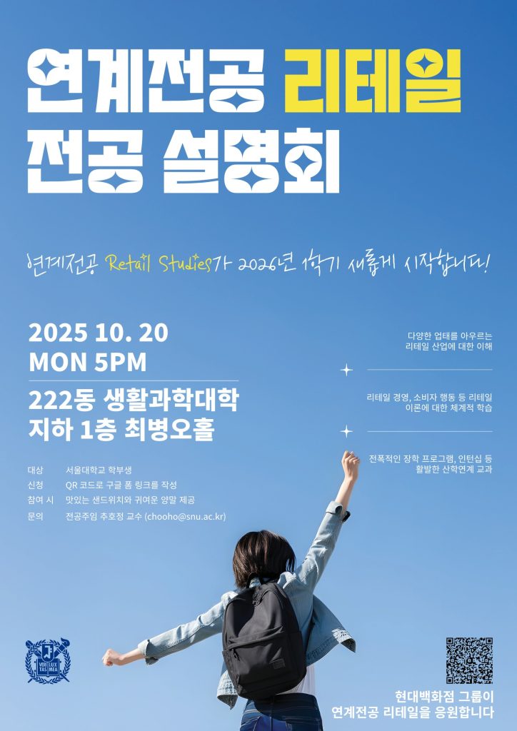 연계전공 리테일 전공 설명회가 2025. 10. 20.(월) 오후 5시에 222동 지하1층 최병오홀에서 진행되오니