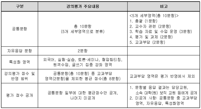 ※ 공통문항 일부에 대한 평균점수에 한하여 교수 교육역량 강화 등 각종 평가에 반영 (단, 특성화영역(협업적 팀티칭 강좌) 점수는 협업적 팀티칭 강좌 선정 심의에 활용)